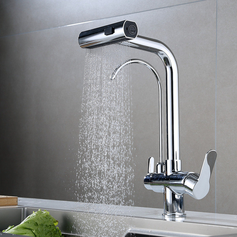 ویژگیهای شیرآلات : اهرمی , دارای 2 دسته , دارای شیلنگ , سردوش سیار , علمک چرخان 360 درجه , صرفهجویی در مصرف آب , آنتیباکتریال , ضد زنگ , بدون نشتی , چرخش ۱۸۰ درجه , مقاومت بالا در برابر سایش , امکان تغییر حالت پاشش آب سردوش